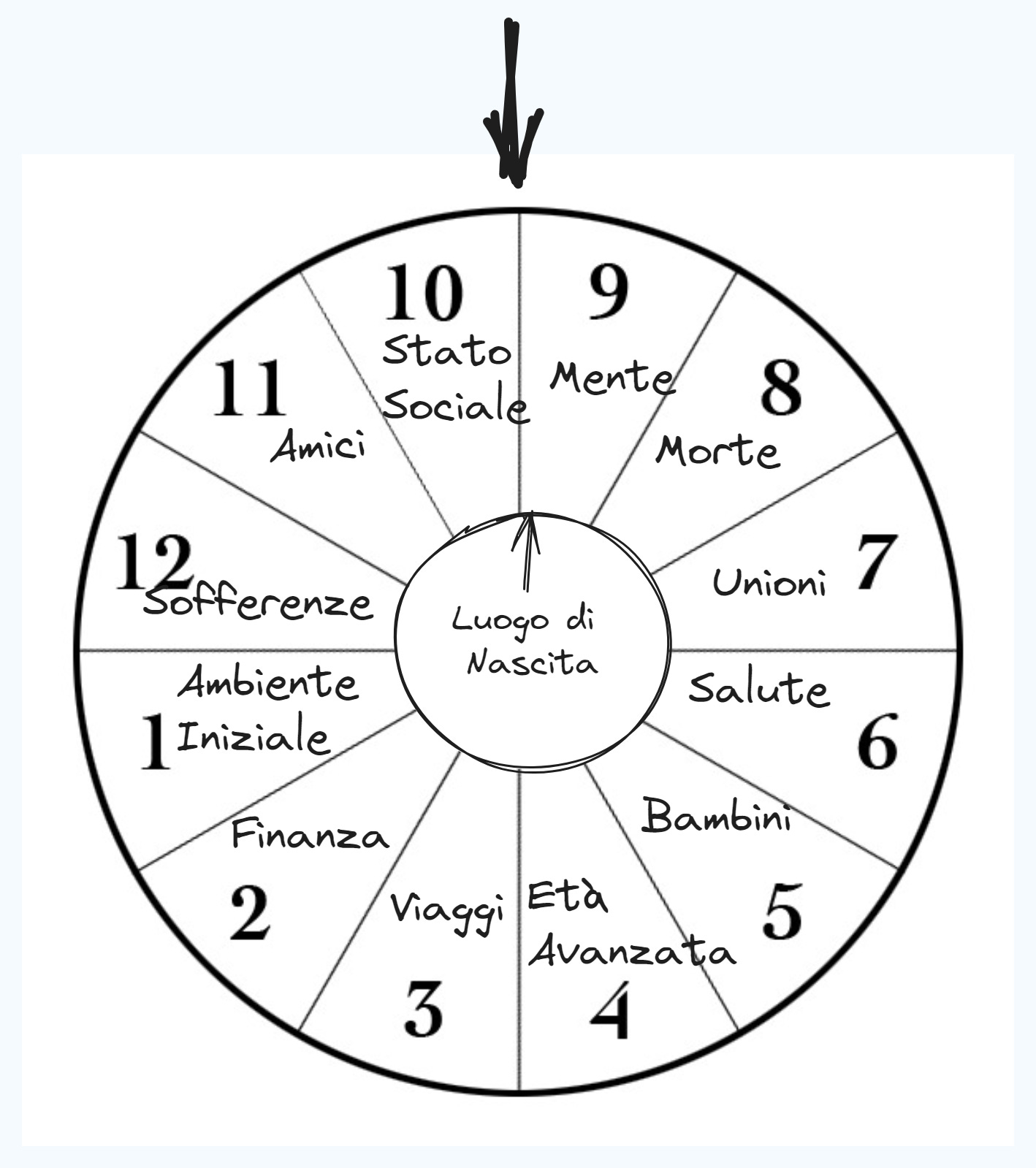 Supponiamo che tu stia in cima alla sfera terrestre, o nel punto indicato dalla freccia nel Diagramma n. 1. Essendo nella parte settentrionale del mondo, guardi a sud quando fissi il sole a mezzogiorno, che è allora nella sua massima elevazione, e il suo raggio cade dall’angolo contrassegnato come 10 nel diagramma. Si è osservato che i pianeti che si trovano in quella “decima casa” alla nascita di un bambino influenzano il suo onore e il suo status sociale, e quindi la decima casa “regola” queste questioni. I pianeti appena sorti ad est alla nascita inviano i loro raggi attraverso la divisione contrassegnata come 1 e si è dimostrato che influenzano la forma del corpo e le condizioni della casa dei genitori; quindi la “prima” casa è quella che determina queste questioni, e così via con tutte le altre case.