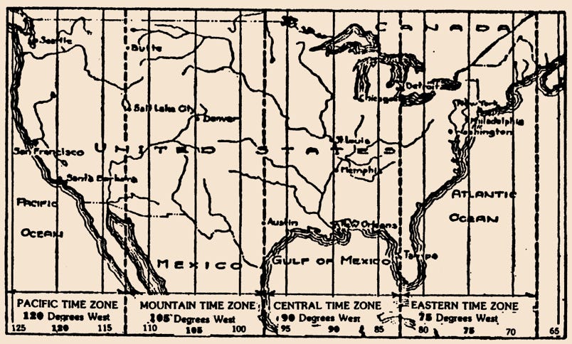 Questa innovazione è nata dalla confusione che esisteva nelle tabelle orarie delle ferrovie prima della sua introduzione. Dove diverse compagnie ferroviarie entravano in una città, ciascuna aveva i suoi orologi regolati secondo uno standard proprio, e inoltre, la gente di quella città aveva il proprio orario locale. A volte l’orologio di una stazione ferroviaria variava di mezz’ora rispetto a quello di un’altra compagnia ferroviaria, e entrambi segnavano un orario diverso rispetto all’orologio del municipio. Fu quindi suggerito che se il paese fosse stato diviso in fusi orari, ciascuno di circa quindici gradi di longitudine (che è la distanza che il Sole percorre in un’ora), e tutti gli orologi in ciascuna divisione fossero impostati su un orario uniforme, calcolato da un meridiano situato al centro del suo fuso orario, la difficoltà sarebbe stata risolta. Di conseguenza, l’America fu divisa in quattro da tre linee immaginarie, come illustrato nel diagramma: